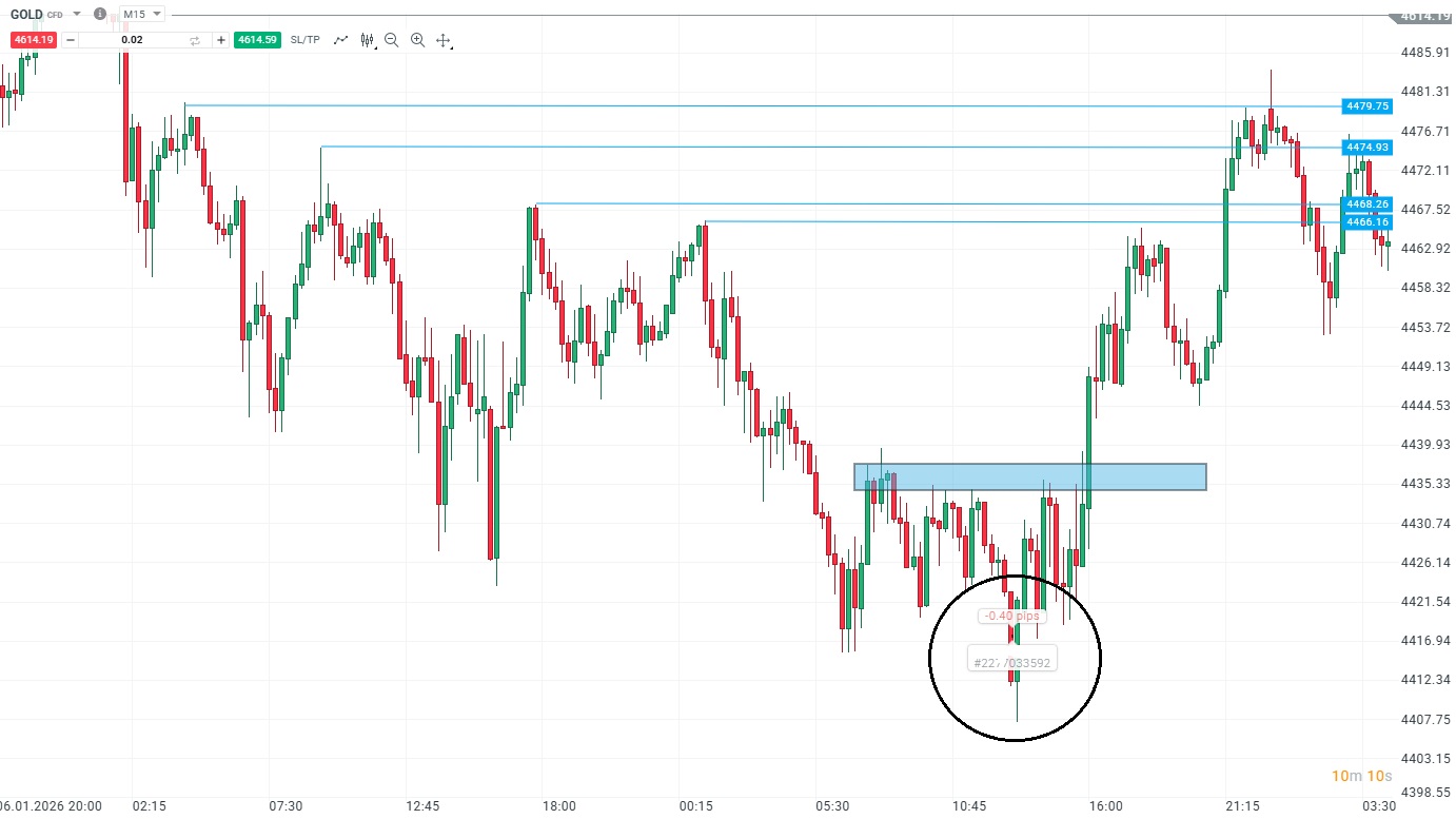 V této ukázce si popíšeme situaci, ve které mi naopak agresivní práce se stop lossem pomohla ušetřit spoustu peněz. Zlato se svého času obchodovalo v down trendu s tím, že trh tvořil nižší maximální hodnoty. V oblasti swingového low navíc trh nemohl prorazit na vyšší hodnoty, vytvořil rezistenci, takže jsem se rozhodl spekulovat na průraz swingového low a pokračování trendu. Vstup do trhu však nebyl ideální. Se stop lossem jsem i zde pracoval agresivně, jelikož jsem chtěl vidět okamžité prodejní momentum.