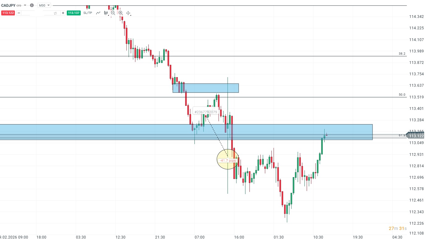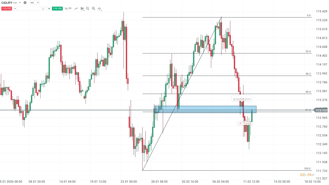 Na měnovém páru CAD/JPY jsem spekuloval na odraz trhu od supportu. Tímto supportem byla menší konsolidace trhu, kterou měnový pár v minulosti otestoval pullbackem. Jednalo se tedy o úroveň, kterou trh v minulosti respektoval, takže existoval předpoklad, že tomu tak bude i v budoucnu. Tomuto levelu navíc nahrávala i konfluence v podobě 61,8 % Fibonacciho retracementu.