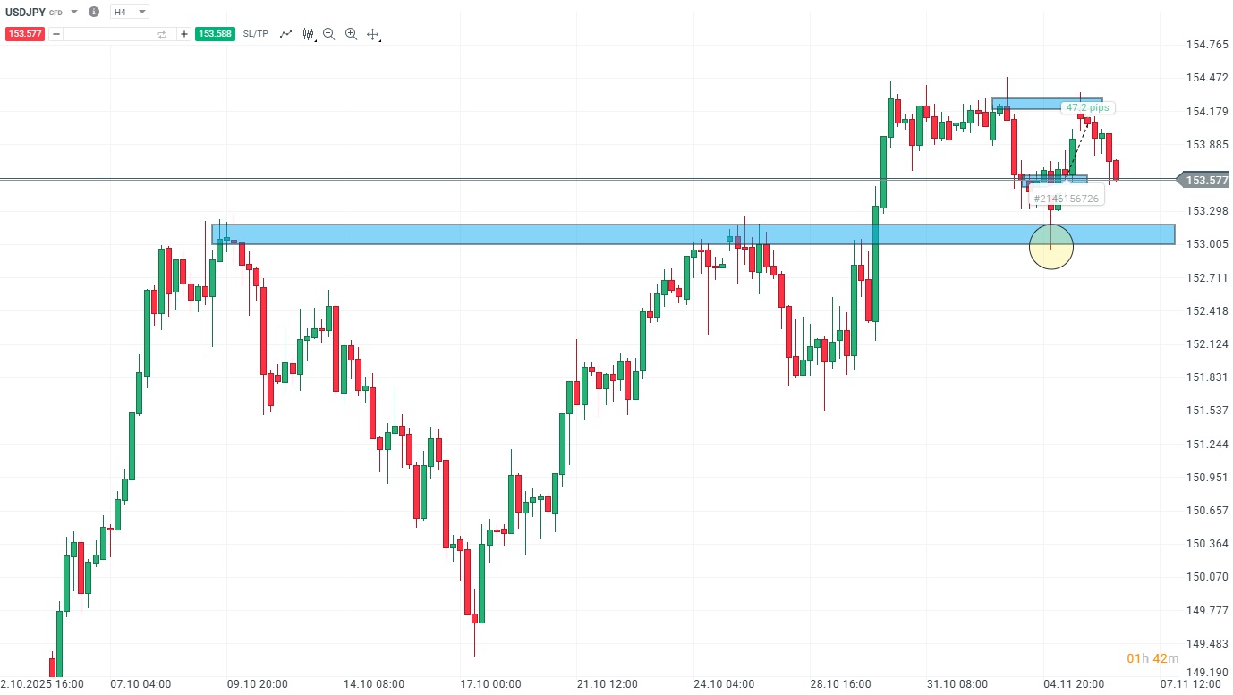 Tento hlavní měnový pár se na H4 časovém rámci obchoduje v rostoucím trendu s tím, že měl tendenci po vytvoření swingového maxima mírně oslabovat. Cenový pokles nebyl naštěstí tak agresivní, jak to v podobných případech někdy bývá. USD/JPY pouze retestoval hodnotu proražených cenových maxim a vytvořil tzv. pullback.