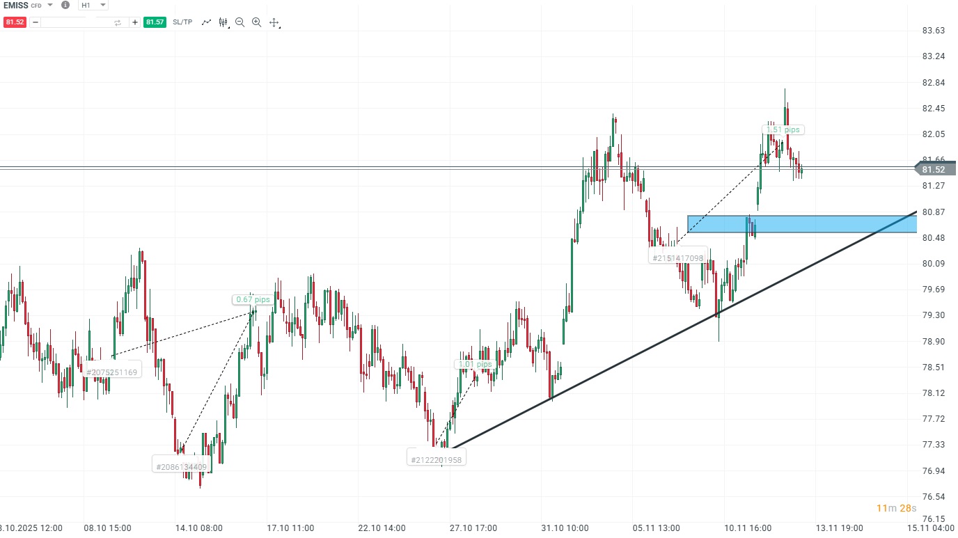 Obchodů na emisních povolenkách mám více. Základní premisou tohoto tradingu je, že se jedná o růstové aktivum, protože EU tento princip záchrany planety hodlá čím dál více uplatňovat. Při tradingu povolenek tedy nevyhledávám shorty, ale snažím se povolenky nakupovat na supportech, popřípadě cenových výběžcích v rámci dna swingového pohybu.