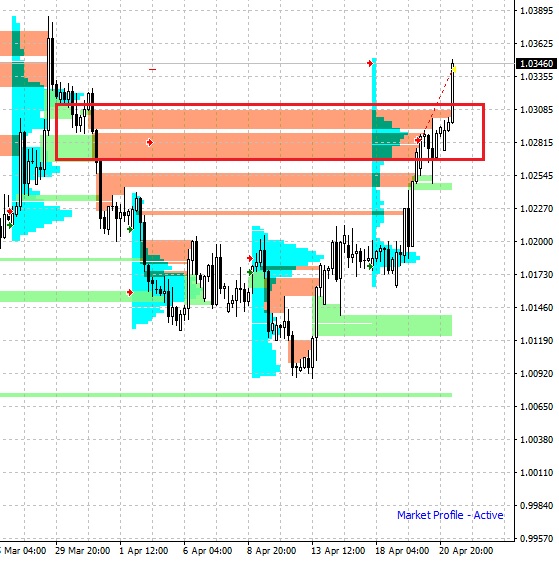Po krátké konsolidaci na High nákupního pohybu, kdy se vytvořila i Volume oblast, došlo dle očekávání ke korekčnímu pohybu, do vzdálenosti 32 pips od vstupní ceny. Po této korekci ovšem převládl dlouhodobě rostoucí sentiment a trh na nejbližší supportní zóně reagoval dalším nákupním pohybem, který celý obchod vrátil do rotace okolo break even.