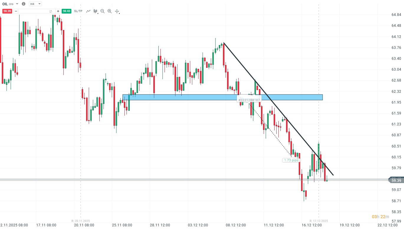 Ropa již několik let nemění svůj fundament ani trend, a proto zde dává smysl vyhledávat pouze obchody ve směru short. V tomto případě jsem obchodoval právě krátkou pozici, a to v rámci breakout strategie. Šlo o průraz cenových minim poté, co trh několikrát zamítl vyšší cenové úrovně. Podle price action a dlouhodobého trendu tak bylo spíše jen otázkou času, kdy k tomuto průrazu dojde.