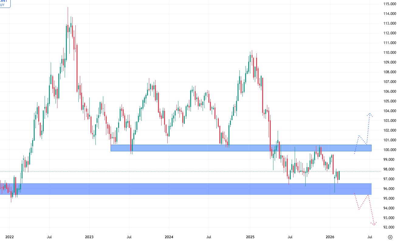 Tento index se již řadu měsíců pohybuje v postranním trendu, kdy americký dolar oslabil pod hodnotu svých dlouhodobých minim. Ze supportu na 100 bodech se stala rezistence, která již několikrát poslala americký dolar na nižší hodnoty. Na druhou stranu na současných úrovních drží index support na 95 bodech, což je technická konsolidace z roku 2022.