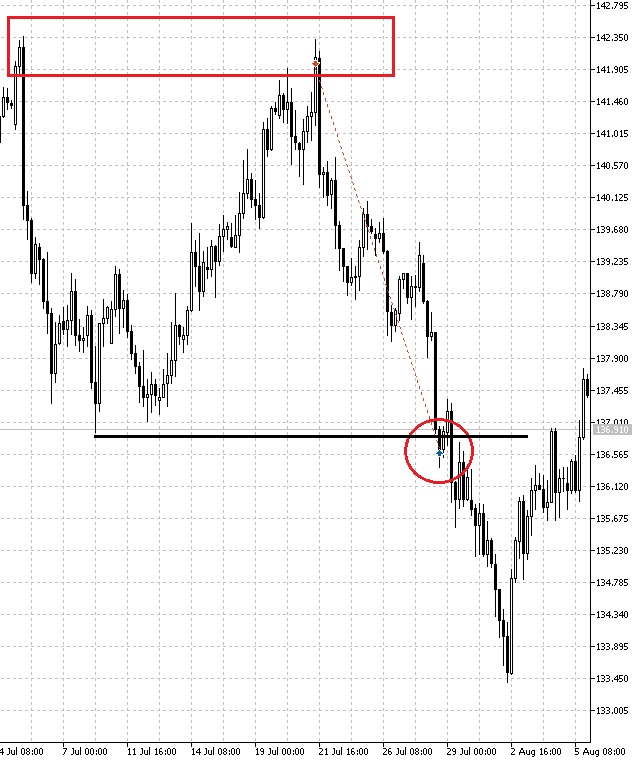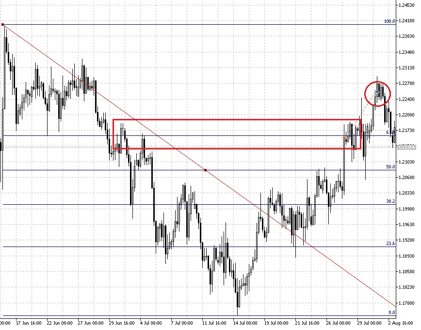 Následující ukázka je ziskový obchod, který byl realizován na měnovém páru EUR/JPY. Podle obchodní strategie se jednalo o spekulaci na short reakci, která měla proběhnout na high cenového výběžku (v konfluenci s některou z Fibonacciho úrovní). Trh cenovou úroveň s čekajícím limitním příkazem nejprve otestoval a po menší prodejní reakci došlo k návratu a tesu vyšších cen, na kterých došlo k exekuci obchodního příkazu.