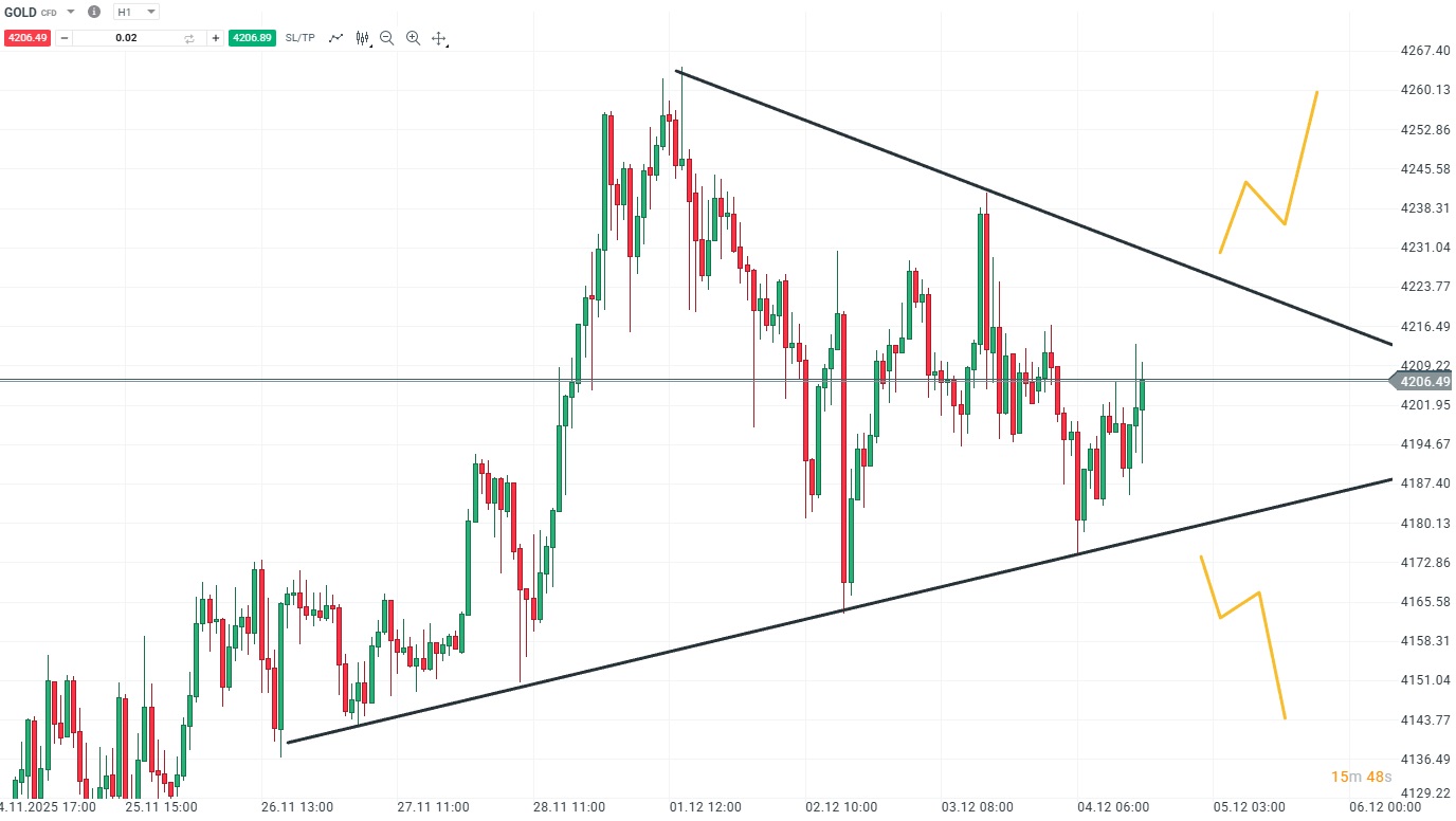 Při pohledu na vyšší časový rámce lze vidět, že se zlato obchoduje uvnitř technické formace triangl. Tato formace bývá velmi často zakončena průrazem trhu buď nad hodnotu klesající trendové čáry, což by znamenalo začátek up trend, nebo průrazem rostoucí trendové čáry, čímž by zlato naopak zahájilo down trend.