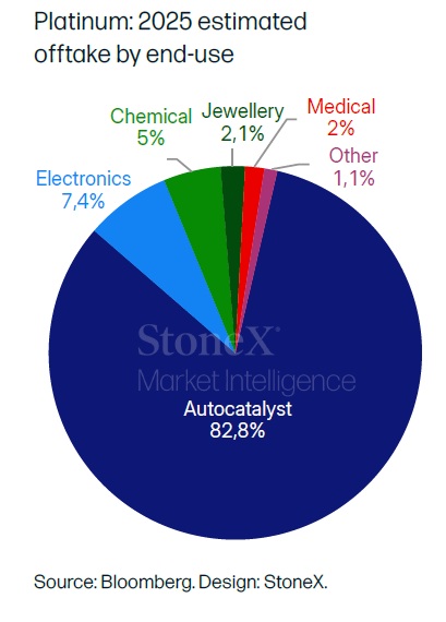 Platina se po globální finanční krizi pohybovala v pásmu bez výraznějšího trendu z důvodu snahy k rychlému směřování k zeleným ekonomikám a rozšiřování elektromobilů. Bílý kov se používá převážně u výroby katalyzátorů aut na dieselový pohon. V mnohém menším procentu pak v elektronice, chemickém, šperkařském, medicínském a dalších průmyslech: