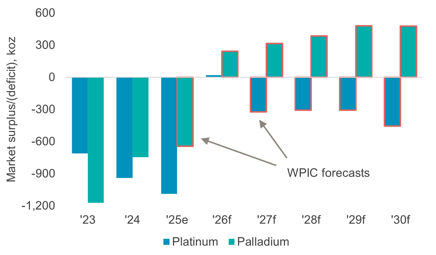 Podle Světové organizace platiny má po letech deficitů světové nabídkově poptávkové bilance dojít tento rok sice k vyrovnání, nicméně omezení v nabídce (silná koncentrace většiny produkce v JAR a Rusku) a pokračující silná poptávka mají zapříčinit opět deficity v následujících letech: