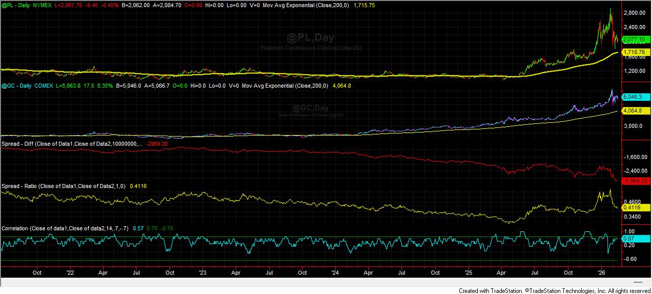Závěrem se pojďme podívat na vývoj ceny platiny a ceny zlata a jejich spreadové a korelační poměry na burze v Chicagu od konce 2021 (Tradestation, denní data):