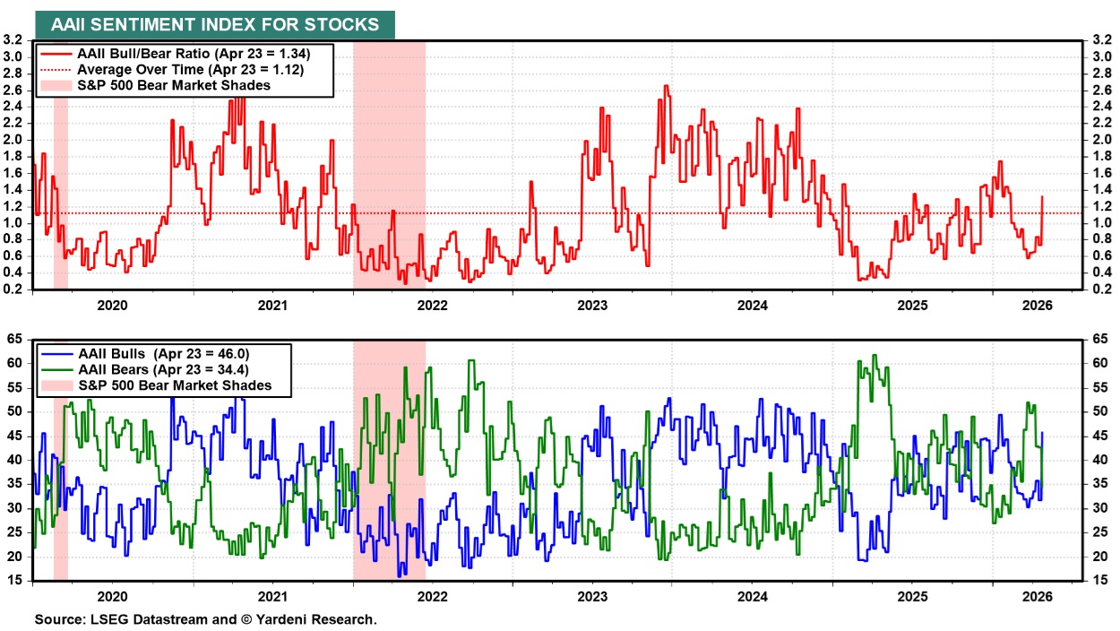 Po prudkém posílení ve stylu „V“ z lokálního minima březnové korekce vypadá trh krátkodobě technicky překoupený. Z hlediska sentimentu (dle poměrů jako AAII Bull/Bear nebo Schwab STAX index) je však situace stále jen mírně nadprůměrně pozitivní. Kontrariánsky vzato, k výraznější korekci bychom zřejmě museli zaznamenat vyšší hodnoty.