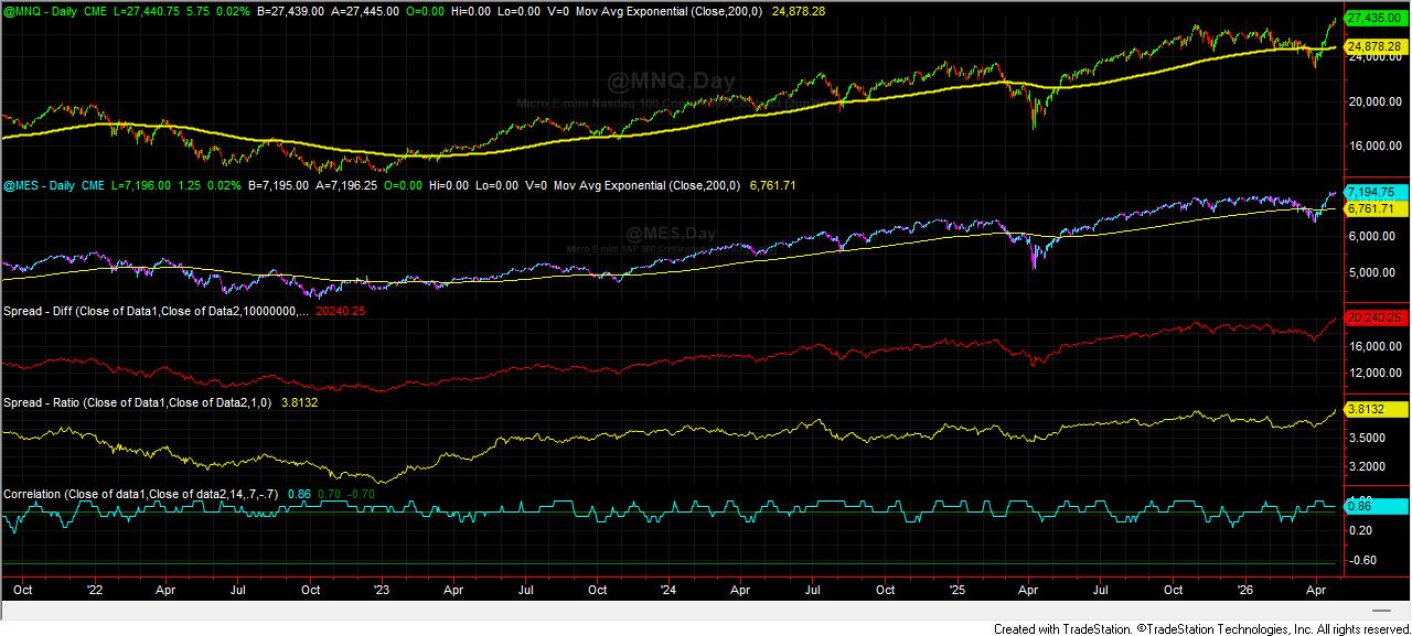 Závěrem se podívejme na vývoj populárních indexových kontraktů Micro Nasdaq 100 (MNQ) a Micro S&P 500 (MES) a jejich spreadové a korelační poměry na burzách v Chicagu od konce roku 2021: