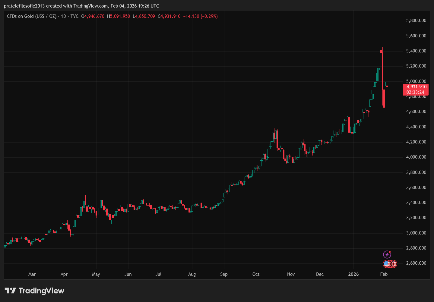 Vývoj ceny zlata za poslední rok (denní časový rámec):
