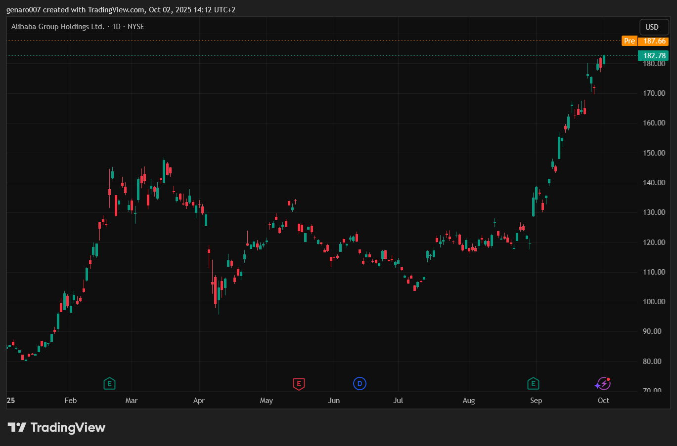 Vývoj ceny akcií Alibaba za poslední rok (denní časový rámec):