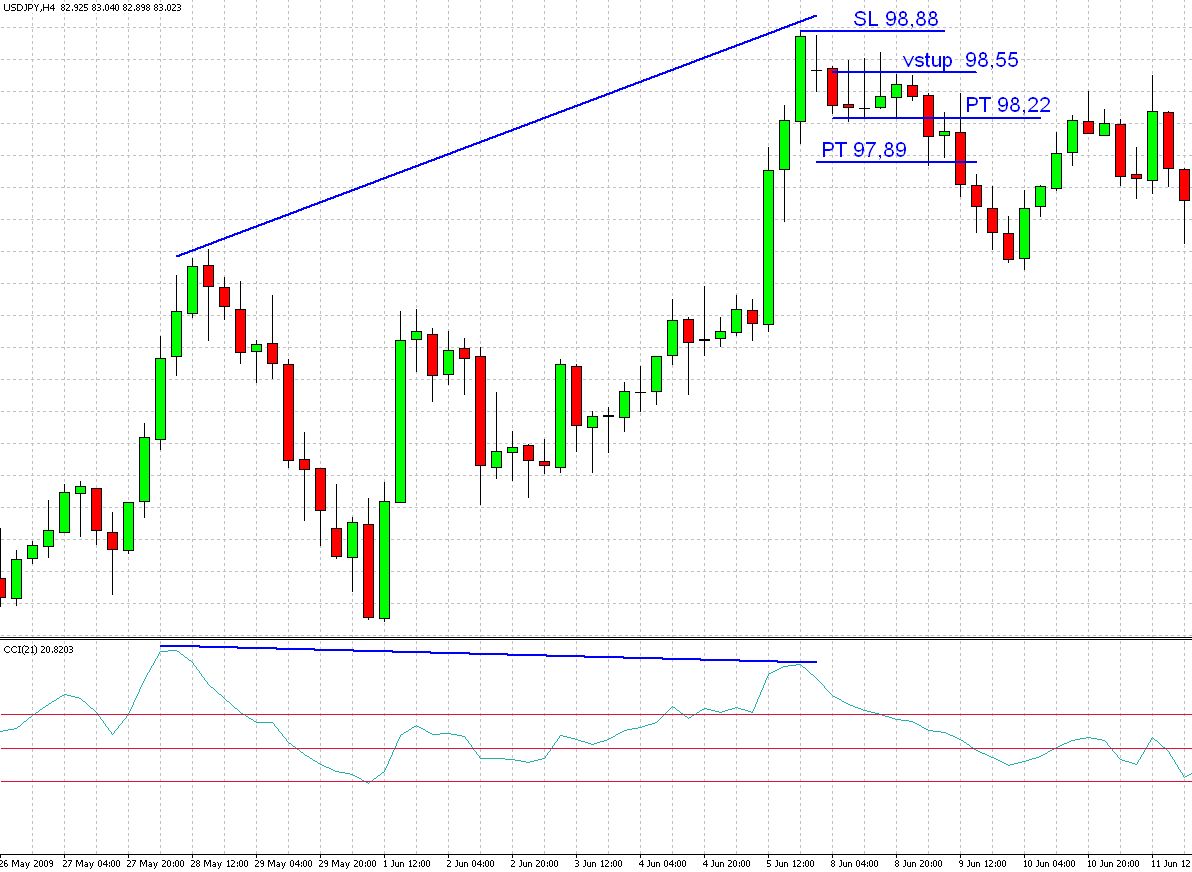 Sledujeme vývoj grafu a indikátoru CCI a vidíme, že se vytváří divergence. Trpělivě čekáme na další vývoj.