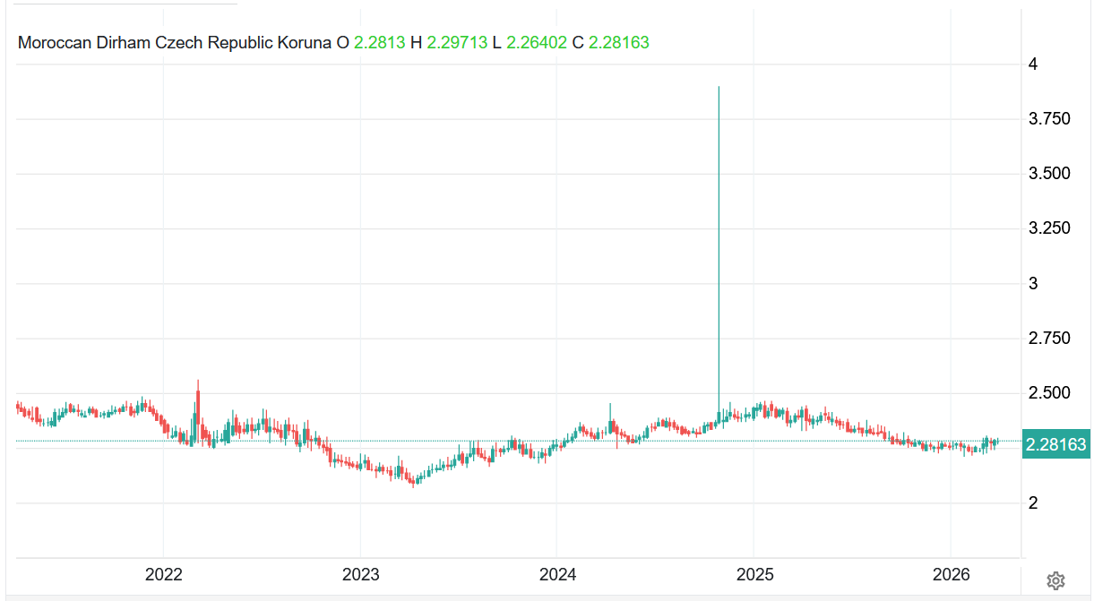 Vývoj kurzu marocké měny vůči české koruně – MAD/CZK (týdenní časový rámec):