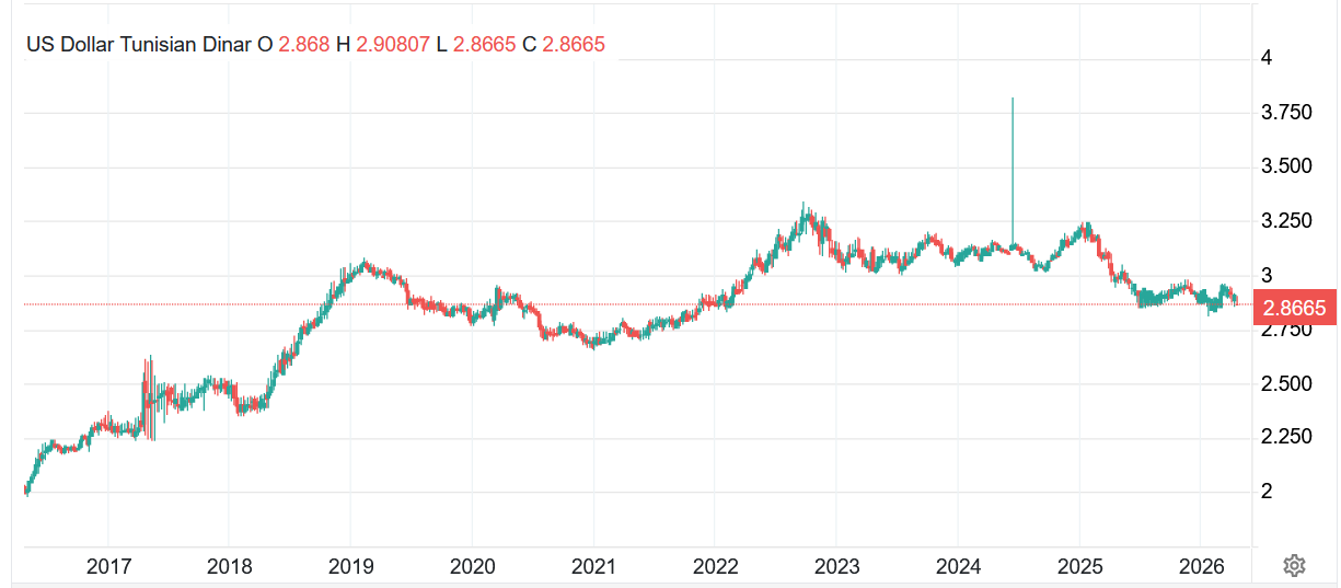 Tím skončilo i navázání na francouzskou měnu, místo toho Tunisko na chvíli navázalo měnu na dolar. Dnes je tuniský dinár oficiálně měnou s volně plovoucím kurzem.