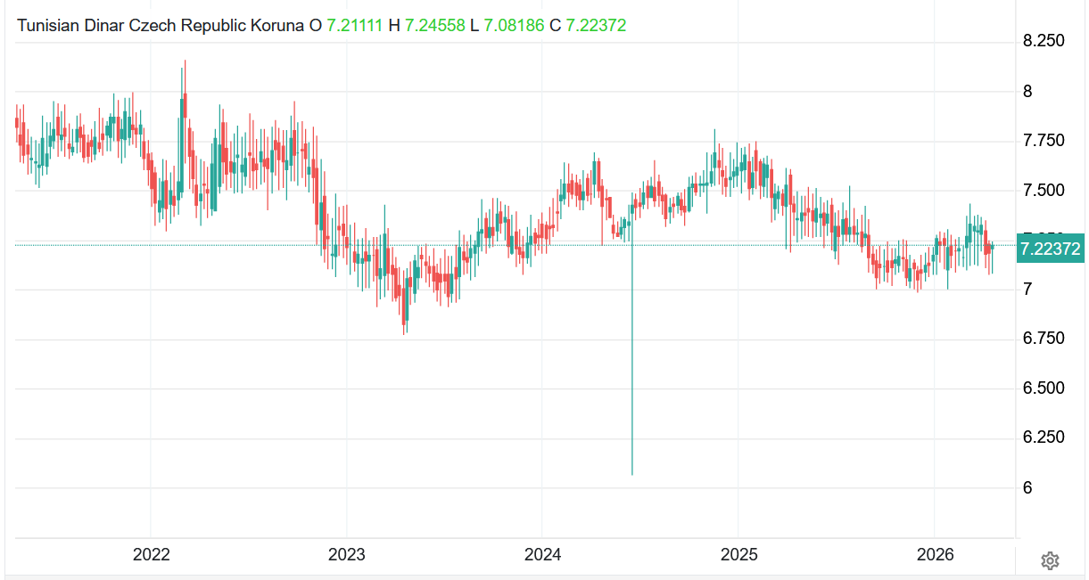 Vývoj kurzu tuniského dináru vůči české koruně – TND/CZK (týdenní časový rámec):