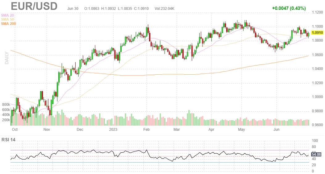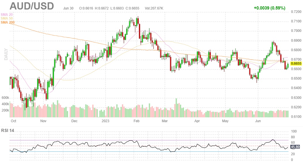 Britská libra byla v červnu druhou nejsilnější měnou. Své síly využila k vytvoření svého letošního maxima, ze kterého ovšem ve druhé polovině měsíce ustoupila. I zde se indikátor RSI nachází v neutrální oblasti a trh měsíc zakončil v oblasti nad krátkodobým klouzavým průměrem SMA 20. Libra vůči americkému dolaru dlouhodobě posiluje a vypadá to, že tento trend by měl být platný i na začátku července.