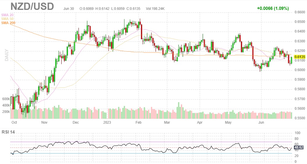 Silná korelace mezi australským a novozélandským dolarem vytvořila velmi podobné podmínky i na měnovém páru NZD/USD. I zde byla první polovina června ve znamení cenového růstu, zatímco ta druhá ve znamení poklesu. Trh obchoduje pod hodnotou všech tří klouzavých průměrů a indikátor RSI se nachází v neutrální oblasti, přičemž z dlouhodobého pohledu se trh nachází v klesajícím trendu.