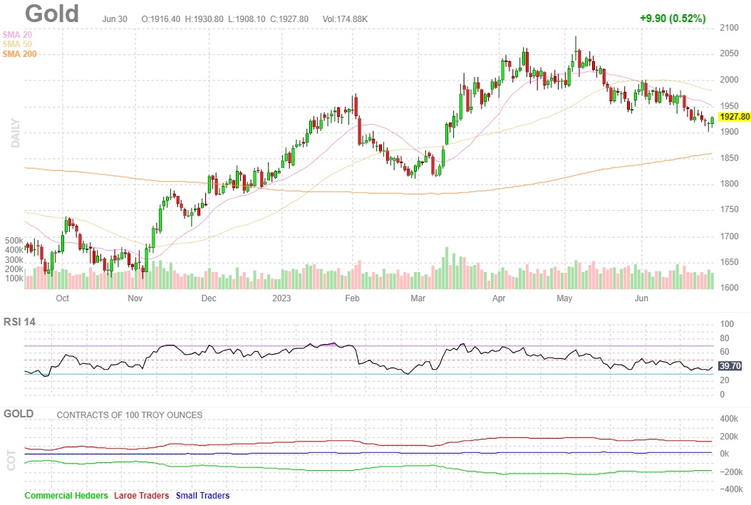 Zlato v červnu pokračovalo ve svém trendu z minulého měsíce. Cenový pokles na tomto trhu nastal po vytvoření historických maxim, což přirozeně do trhu nalákalo spoustu prodejců v kombinaci s výběry zisků. Zlato se obchoduje pod dvěma klouzavými průměry, ovšem ten dlouhodobý SMA 200 bude tvořit konfluenci nejbližšího supportu nad cenou 1850 USD a na tržní bariéře z února letošního roku. Indikátor RSI v průběhu měsíce atakoval oblast přeprodanosti, nicméně nedosáhl extrémních hodnot. V současné době je již RSI neutrální. COT report na zlato nehlásí žádnou změnu, takže lze očekávat pokračování současného trendu.