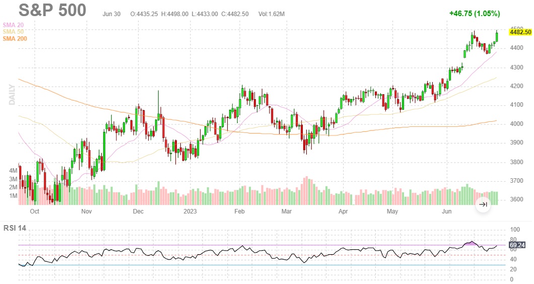 Akciový index S&P 500 boří veškeré ekonomické teorie, protože vykazuje silný růst v období vyšších úrokových sazeb. Během června se ovšem vyrojily spekulace, že tento index táhnou vzhůru především velké technologické společnosti, jejichž akcie jsou však výrazně přeceněny. Možná, že začátkem měsíce si přílišná valuace big tech společností vybere svou daň, protože index S&P 500 může vytvořit formaci dvojitý vrchol, což je velmi účinná reverzní formace. Tento scénář může naznačovat i indikátor RSI, který se blíží své překoupené oblasti. Pokud se tak ale nestane, můžeme se nejspíše během letních prázdnin těšit na tvorbu nových historických maxim na tomto akciovém indexu.