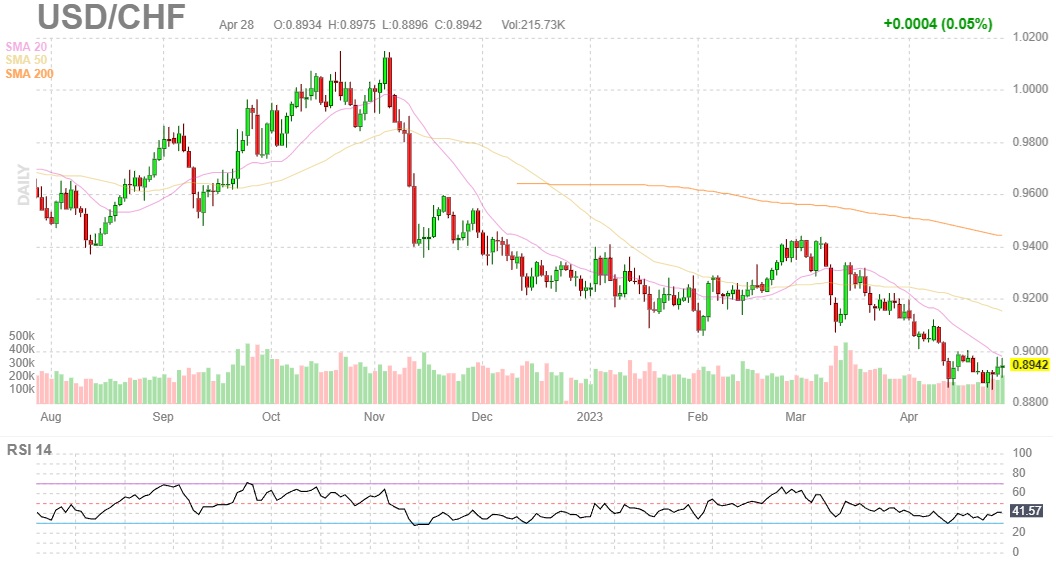 Stabilní posilování dopomohlo švýcarskému franku k roli nejsilnější dubnové měny. Již od listopadu tak švýcarský frank stabilně posiluje. Na jeho výkonnost neměly vliv ani problémy ve švýcarském bankovním sektoru, kterých jsme v dubnu byli svědky. Indikátor RSI se nachází v neutrální oblasti a trh koncem měsíce reagoval na hodnotu krátkodobého klouzavého průměru vykreslením neutrální doji svíčky. Začátek května může být tedy jak ve znamení pokračujícího posilování franku, tak ve znamení korekčního pohybu.