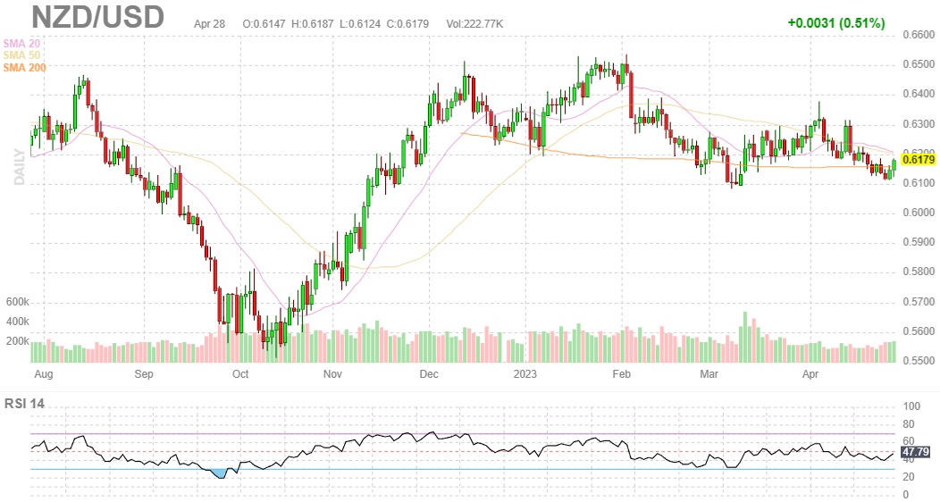 Díky vysoké míře korelace je situace na novozélandském dolaru velmi podobná té na australském dolaru. Měnový pár se obchoduje již druhý měsíc v postranním trendu. Trh osciluje okolo všech tří klouzavých průměrů a vyčkává na fundamentální impuls k silnějšímu trendu. Na tomto měnovém páru je dlouhodobější trend klesající, protože cenový graf tvoří od začátku roku nižší maxima a nižší minima. RSI se nachází opět v neutrální oblasti.