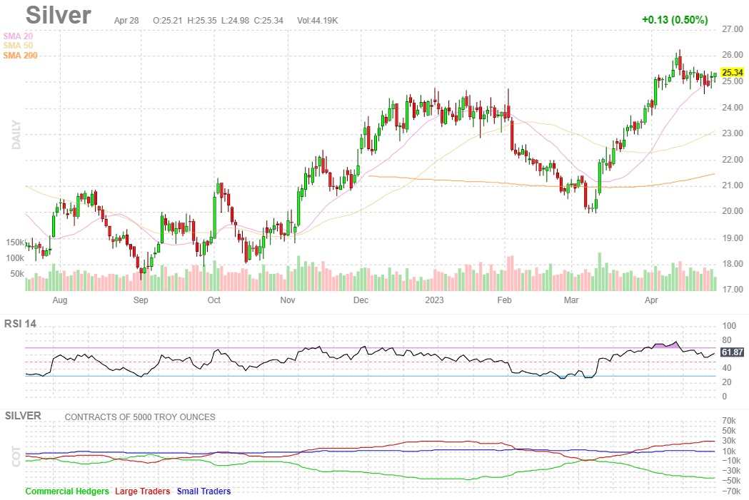 Na trhu s tímto drahým kovem je situace o něco lépe predikovatelná. Trh vytvořil své cenové maximum, které bylo ovšem záhy zamítnuto. Vzhledem k tomu, že trh začal konsolidovat na nižších cenách, může se jednat o projev nedostatečné poptávky. Tuto variantu také signalizuje COT report, který hlásí nárůst prodejních pozic u Hedgerů, zatímco nárůst long pozic je u velkých obchodníků minimální. Indikátor RSI se nachází v horní polovině neutrální oblasti, což signalizuje velký prostor pro prodejní korekci, případně vznik prodejního trendu.