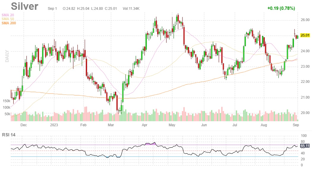 Zlato v polovině srpna otestovalo dlouhodobý klouzavý průměr SMA 200, od kterého se odrazilo směrem vzhůru. Cenová zóna, od které se klesající cena zlata odrazila, tvořila konfluenci s cenovým minimem z června/července. Cena 1 910 USD byla tedy druhou nejlepší cenou k nákupu za posledních 5 měsíců. Začátkem září se zlato obchoduje nad hodnotou všech tří klouzavých průměrů, což značí rostoucí trend a indikátor RSI predikuje možné pokračování růstu, protože se nachází v neutrální oblasti.