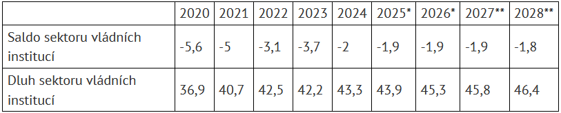 Strukturální schodek, tedy saldo očištěné o mimořádné výdaje a vliv hospodářského cyklu, by letos měl být 1,9 procenta HDP, příští rok klesne na 1,8 procenta HDP. V dalších letech ale ministerstvo očekává jeho návrt mírně nad dvě procenta. Podle zákona o rozpočtové odpovědnosti by se přitom strukturální saldo mělo postupně snížit k jednomu procentu HDP. Národní rozpočtová rada proto už dříve upozorňovala, že pro dodržení zákona bude nutné nejpozději pro rozpočet roku 2027 přistoupit k další konsolidaci veřejných financí.