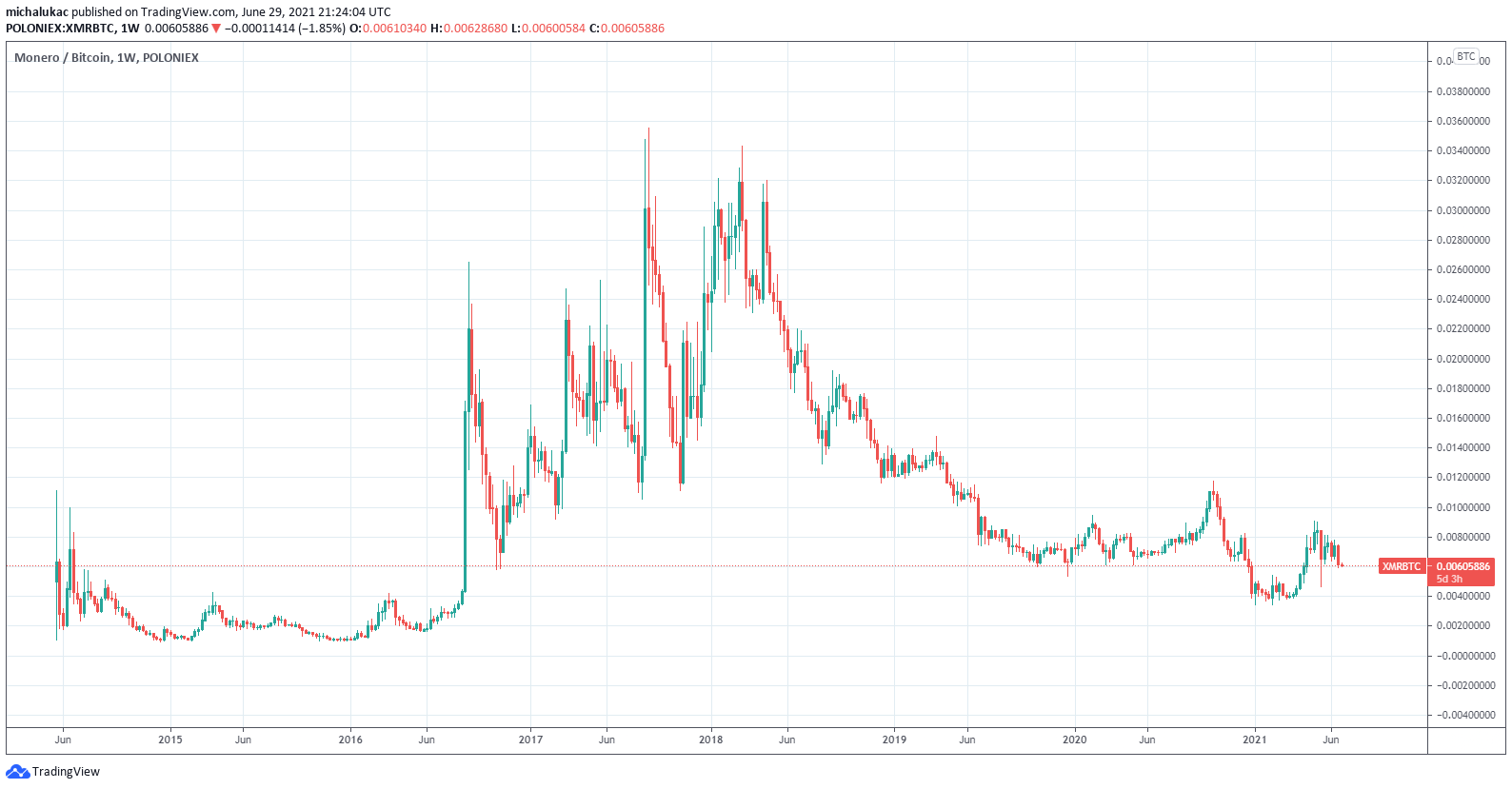 Najlepšie to môžeme porovnať na grafe XMRBTC, kde môžeme vidieť, že od augusta 2016 až po posledný kvartál roku 2020 bolo Monero silnejšie voči Bitcoinu ako je teraz, ale zároveň dno zo začiatku tohto roka je trojnásobne vyššie ako dná z rokov 2015 a 2016. Ak kurz XMRBTC neklesne na nové hlbšie minimum, môžeme hovoriť o potvrdení dlhodobého rastového trendu na tomto páre.