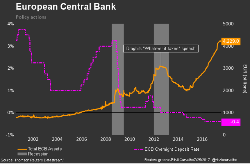 Ekonomika eurozóny je nejsilnější za posledních 6 let. HDP v druhém čtvrtletí stoupl meziročně o 2,2 procenta, což je nejrychlejší tempo růstu od roku 2011. Rovněž indexy nákupních manažerů (PMI) atakují nejvyšší hodnoty od roku 2011. Samotná ekonomická aktivita naznačuje, že ECB by mohla zahájit proces snižování objemu nákupů dluhopisů a postupně odstraňovat obrovské měnové stimuly, které jsou z velké části zdrojem růstu hospodářství zemí eurozóny.