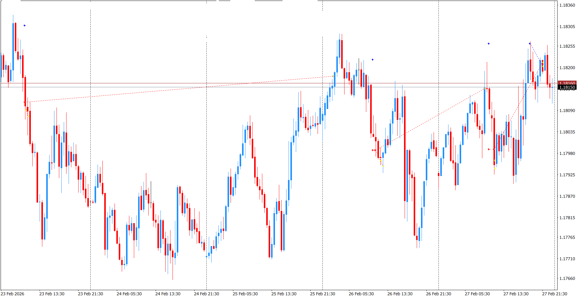 Všechno odstartovalo už v pondělí. Hned zkraje týdne se aktivoval čekající pokyn short. Jak je v mé strategii zvykem, po mírném pohybu správným směrem došlo ke dvěma rychlým odprodejům. To je pro mě klíčový moment. Pozice se tím uklidnila, a já už vím, že tento obchod v podstatě nemůže dopadnout špatně. Následovala fáze, kterou mám v tradingu nejraději. Bezpečné a dlouhé čekání na to, co bude. Trh se nikam dramaticky nehnal, de facto se pohyboval do strany, což potvrzuje mou tezi, že dlouho trvající obchody jsou pro psychiku i účet mnohem přívětivější než zběsilé klikání.