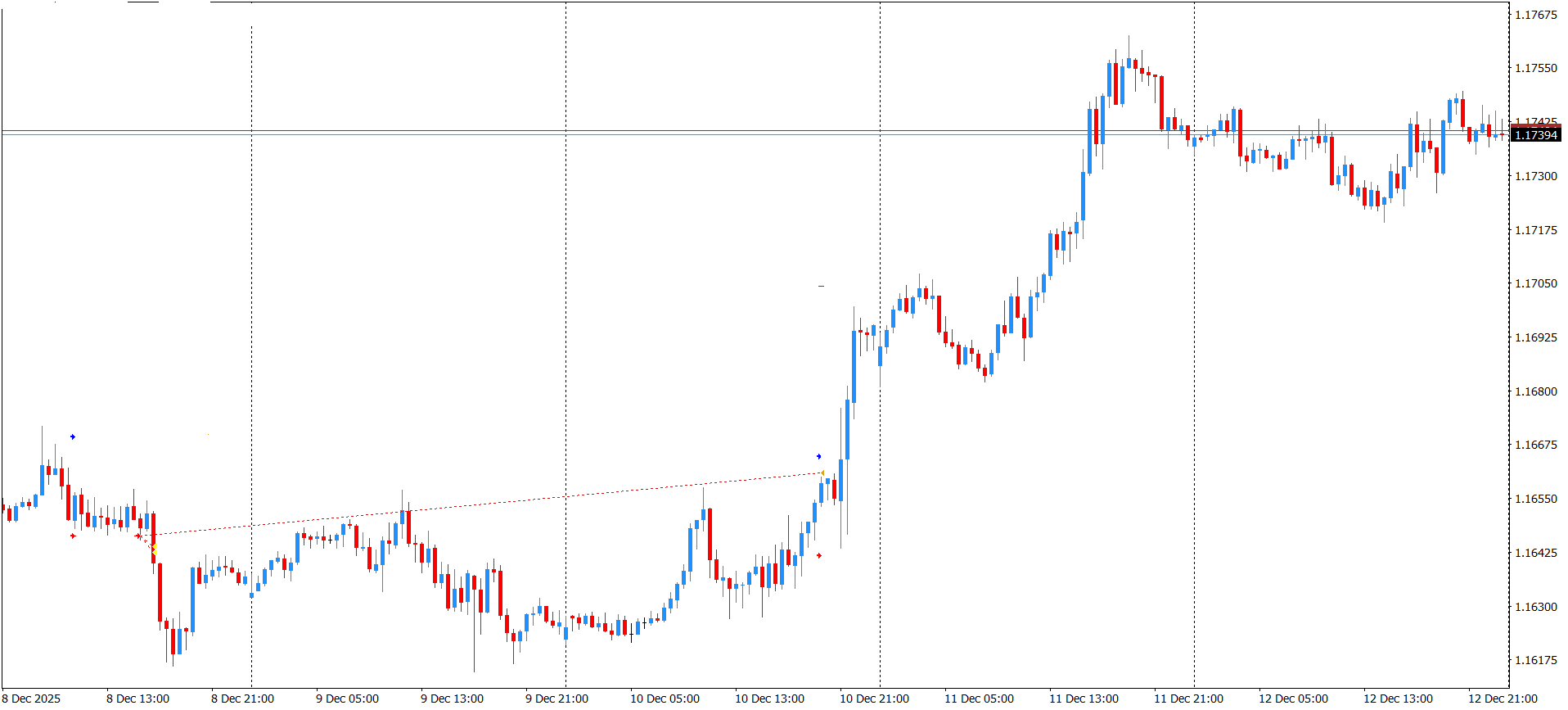Začátek týdne byl poměrně nenápadný. Trh se pohyboval ze strany na stranu, bez výraznějších impulzů, přesto AOS zadal a následně otevřel short. Ten sice způsobně provedl oba odprodeje, ale po pár minutách nadšení skončilo. Trh se vydal do bočního směru, kdy rozmýšlel, co udělat s mým, teď už bezpečným, obchodem. Rozuzlení přišlo ve druhé polovině týdne. Cena se postupně zvedala, tempo se zrychlovalo a graf začal kreslit přesně ty svíčky, které vypadají na screenshotu skvěle, ale v reálném čase už takovou radost nedělají, tím spíš, když zasáhnou přitažený Stop-Loss (SL). AOS má své podmínky nastavené jasně a disciplinovaně je dodržuje, což v tomto případě znamenalo, že se už do konce týdne do žádného obchodu nešlo, protože v rozhodné době nebyly splněny podmínky pro zadání čekajících pokynů. Kdybych u toho byl online, mohl bych sledovat, jak trh roste, testuje úrovně, krátce se zastaví a pokračuje dál. Bez dramat, bez výrazných návratů, zkrátka skoro učebnicový trend. Přesně ten typ pohybu, který člověku připomene, že strategie není od toho, aby chytala všechno, ale aby chytala to své. A to své si tentokrát prostě nevzala.
