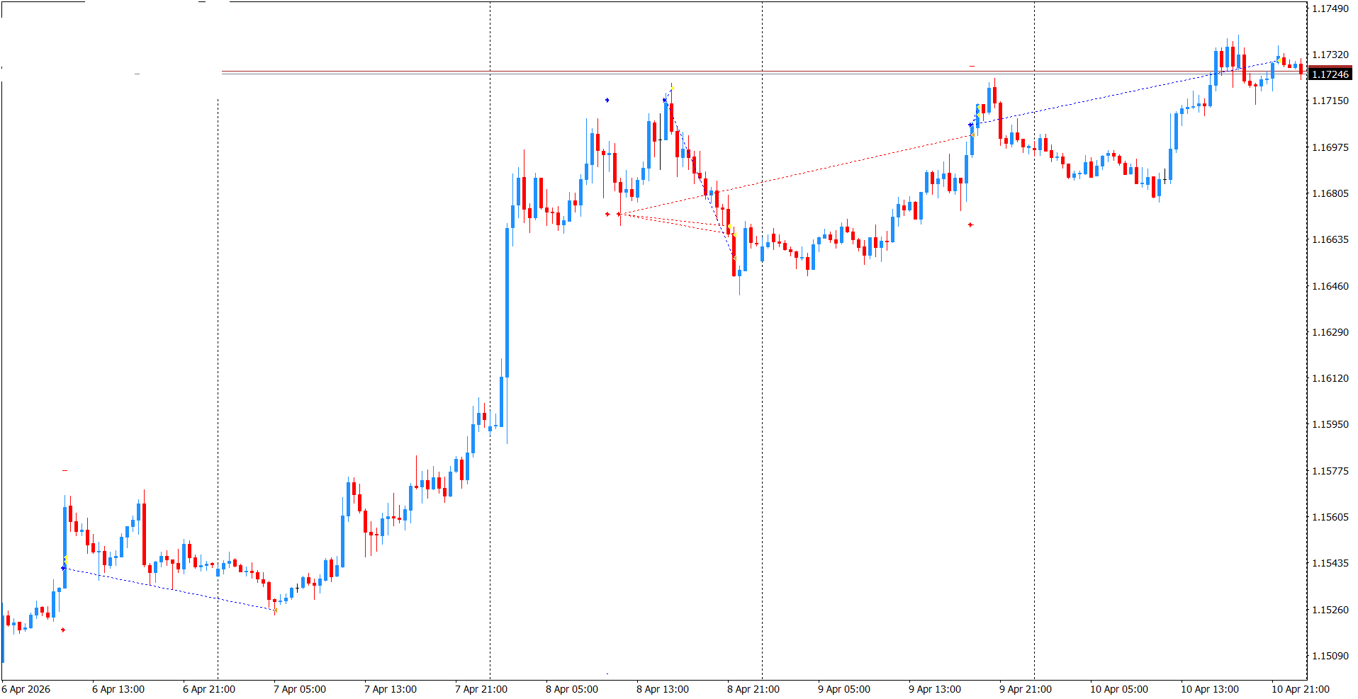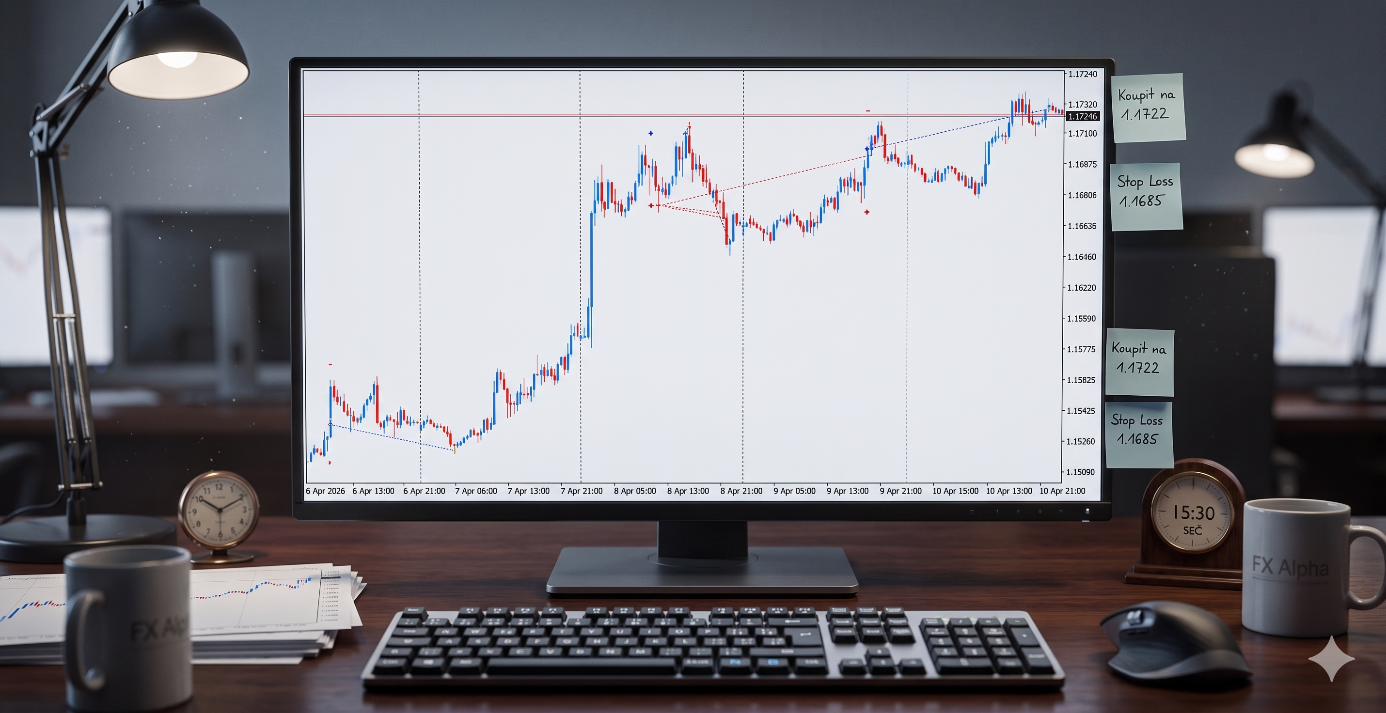 V pondělí se jako první a jediný obchod otevřel čekající long. Byl to hodně velký a rychlý pohyb, který poslal tento obchod prakticky okamžitě do klidu. Bohužel nedosáhl na Take-Profit (TP), i když na to měl dva pokusy. Přesto přitáhl Stop-Loss (SL), takže když v úterý trh doklesal k pondělnímu open, jeho zasažení nebylo ničím vážným. Úterý potom bylo zpočátku tak klidné, že trh nevytvořil dostatečný range k tomu, aby bylo možné nastavit čekající pokyny. Středa potom byla tím nebezpečným dnem. Nejprve to vypadalo na falešný průraz ve směru shortu. Bylo to hodně adrenalinové, když nedošlo ani k jednomu odprodeji a trh se vydal na sever. Až do odpoledne to vypadalo na průšvih, ale to ještě ani zdaleka nebyl konec tohoto thrilleru. Přišlo totiž na řadu otevření longu, ale i tady to bylo takové cudné pošťouchnutí. Naštěstí se povedl alespoň jeden částečný odprodej, což se v závěru ukázalo jako důležité. I v tomto případě trh otočil a i když zvolna, vracel se do neodprodaného shortu. Pozdě večer se potom všechno vyřešilo. Odprodeje krátké pozice a SL té dlouhé. Následovalo opět pomalé stoupání, které ve čtvrtek v podvečer ukončilo celou nešťastnou středu. AOS ještě dokázal otevřít další long, ale ten už byl v pohodě a v klidu si, přes velkou korekci, došel pro docela dobrý výsledek.