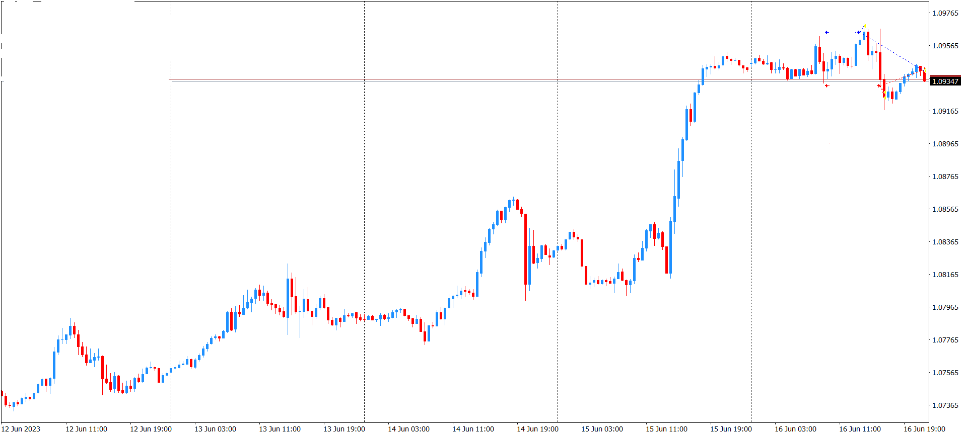 V pondělí podmínky AOSu nedovolily zadat čekající pokyny z důvodu příliš malého range, který se vytvořil v rozhodujícím období. To stejné se potom stalo v úterý, ve středu a ve čtvrtek. Až v pátek přišel na řadu první obchod. Tedy dva. Trh nejprve aktivoval čekající pokyn long, který však jen jednou odprodal před tím, než se cena rozhodla vydat v opačném směru. Následovalo otevření shortu, který odprodal dvakrát, což už bylo docela v pohodě. Po těchto výkonech se trh opět začal vracet do směru longu, avšak neměl už dost síly vystoupat víc a tak se večer zavřelo v území mezi oběma pokyny. Vzhledem k tomu, že long odprodal jen jednou, výsledek nebyl tak dobrý, jak by dobrý být mohl.