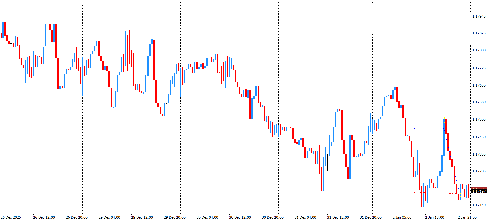 Na první pohled graf nevypadá úplně mrtvě. Cena se hýbe, svíčky se střídají, a občas přijde dokonce i svižnější impuls. Při bližším pohledu je ale vidět, že většina těchto pohybů postrádá rozhodnost. Trh se motá v poměrně úzkém pásmu, dělá krátké pohyby jedním směrem, aby se vzápětí zase vrátil zpět. Prostě nikomu se nechce nic pořádného dělat. Konec roku jede vyloženě na volnoběh. Trh reaguje spíš náhodně, bez jasného směru, a připomíná spíš čekárnu než adrenalinovou atrakci. V takovém prostředí by měl každý, kdo má systematickou strategii, být obezřetný. Ne proto, že by byla strategie špatně nastavená, ale proto, že prostě není co obchodovat. Podmínky pro vstupy chybí, stejně jako mně v první polovině týdne a riziko falešných průrazů roste. I proto má moje strategie zabudovanou podmínku minimální velikosti obchodovaného pásma. V každém případě, dva obchody jsem přeci jen udělal. Bylo to v první obchodní den v novém roce. A byl to short i long. Oba dva rychle odprodali, tím pádem nemohli dopadnout špatně.