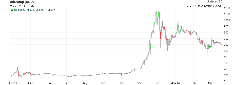 Vývoj hodnoty bitcoinu (v USD na burze BitStamp) za poslední rok: