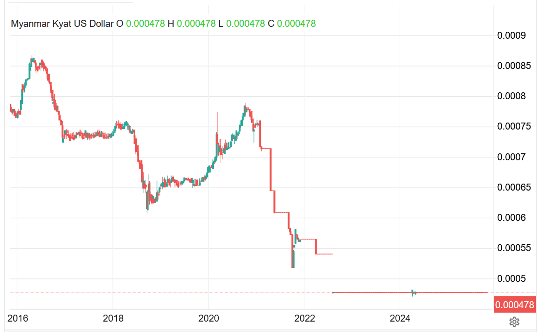 I přes tento dynamický vývoj se v zemi stále platí kyatem. Jde však o mimořádně slabou měnu, která pro forexové tradery není úplně nejpřitažlivější.
