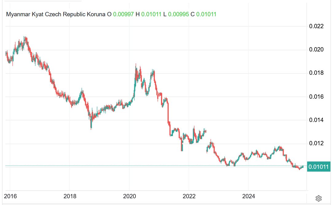 Vývoj kurzu myanmarského platidla vůči koruně – MMK/CZK (týdenní časový rámec):