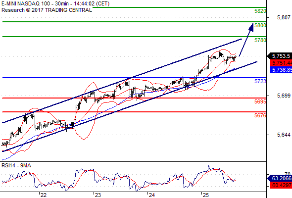 Klíčová slova: Intradenní výhled | Nasdaq | Indikátor | Long | Pozice | RSI | Rezistence | Trading | Cena | Pivot | Signály | Trading Central | Supporty a rezistence | Výhled |