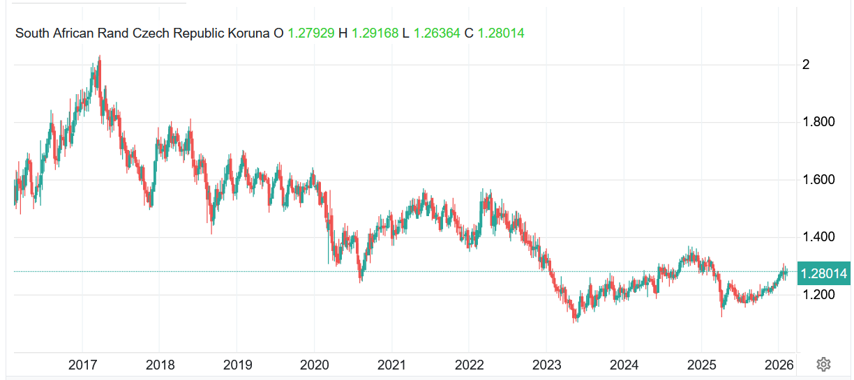 Vývoj kurzu jihoafrického randu vůči české koruně – ZAR/CZK (týdenní časový rámec):