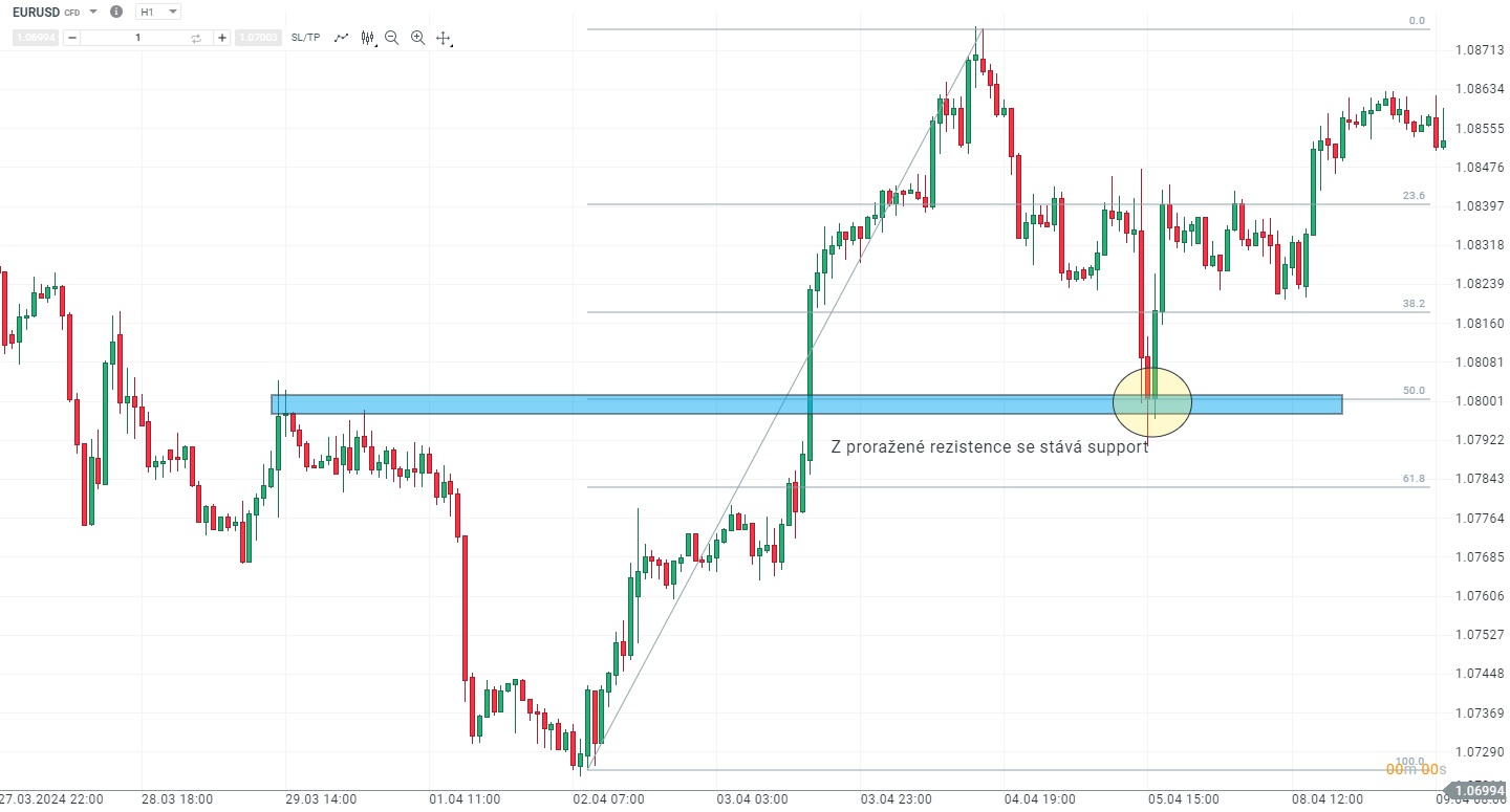 Druhá ukázka na cenovém grafu níže zahrnuje jednoduchý princip, který hovoří o tom, že z proraženého supportu se stává rezistence, což se v tomto případě zcela potvrdilo. Vstup je zde poněkud složitější, a proto je potřeba vyčkávat na nižším časovém rámci pro potvrzení reakce na rezistenci.