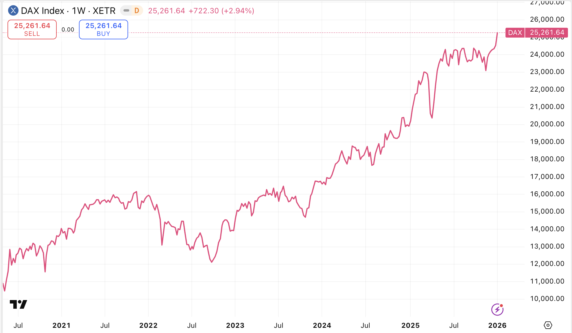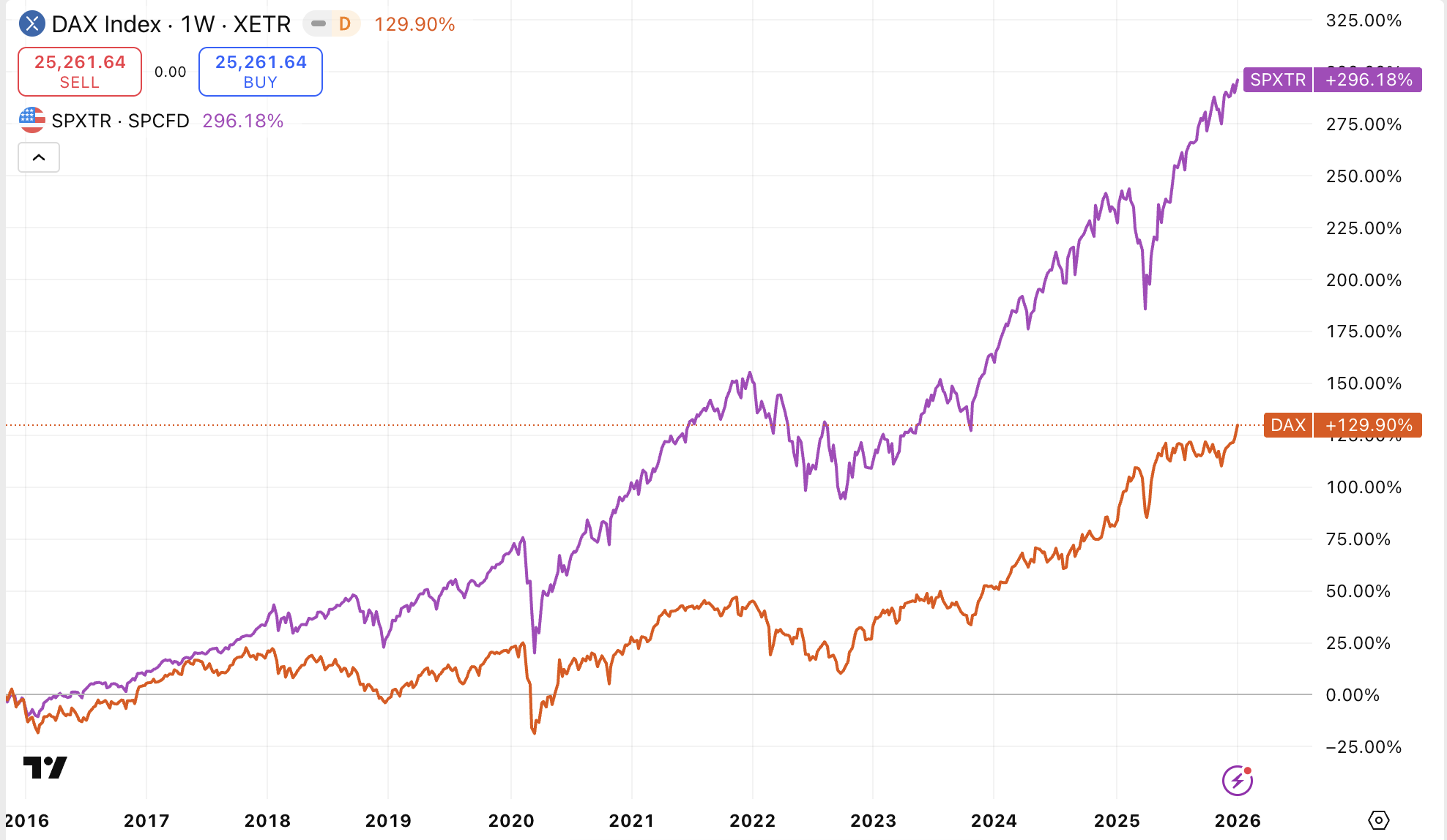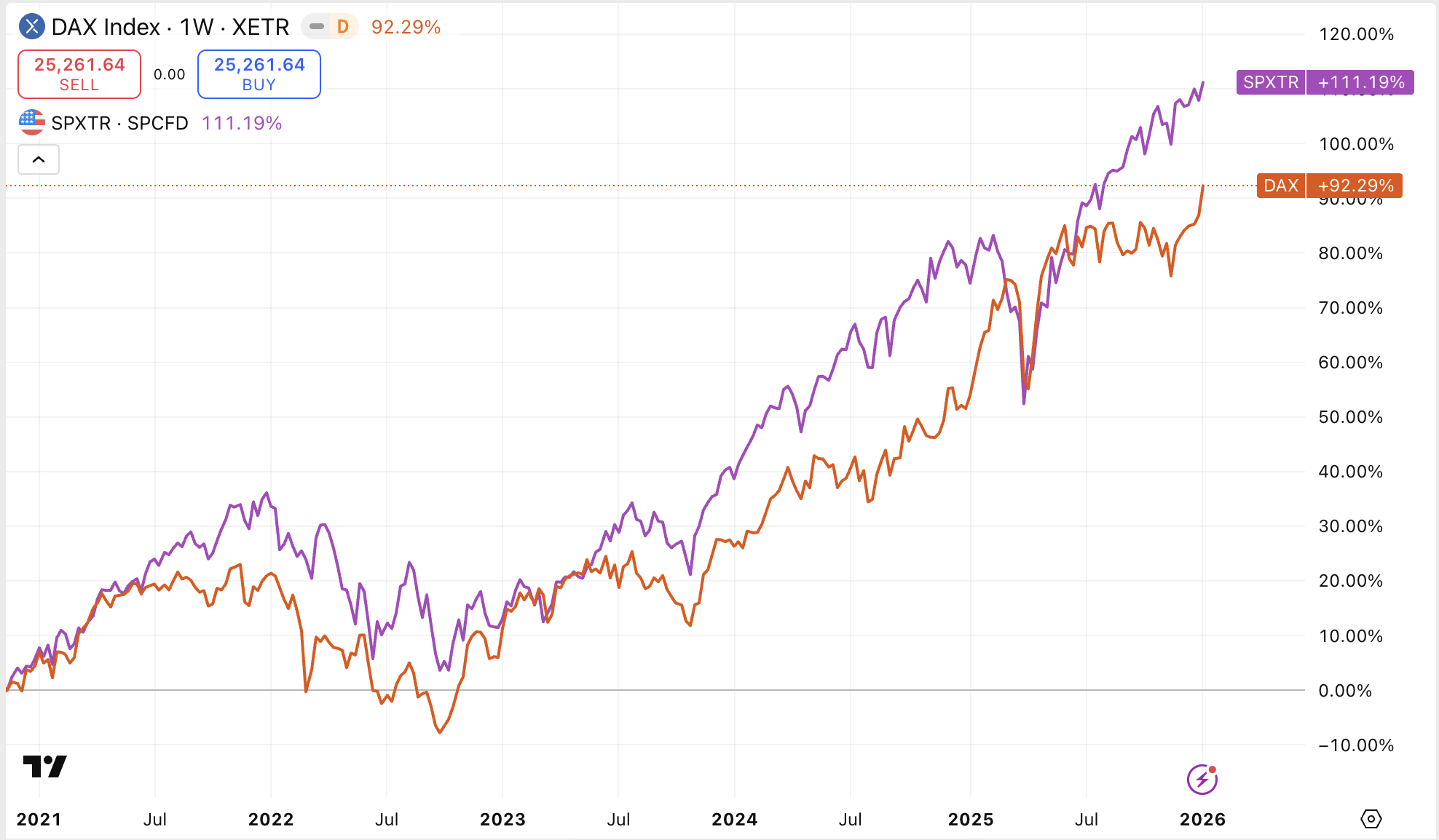 Pokud porovnáme výkon obou indexů v roce 2025, pak německé akcie jednoznačně vyhrály: index DAX v roce 2025 vyrostl o 23 %, zatímco index S&P 500 vyrostl o 16,4 %.