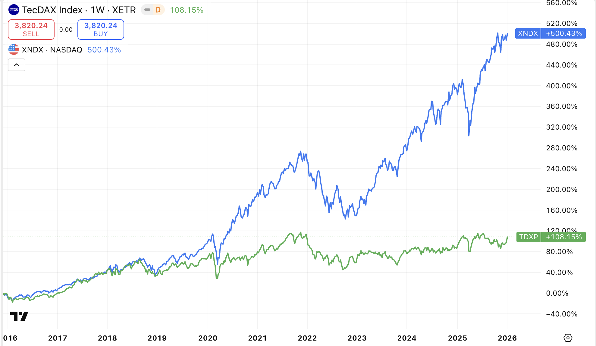 Pokud vás napadlo, že TecDAX je německá obdoba amerického akciového indexu Nasdaq 100, tak z hlediska výkonnosti tomu tak bohužel není: zatímco TecDAX za posledních deset let přidal něco málo přes 100 %, Nasdaq 100 ve stejném období vzrostl o více než 500 %.