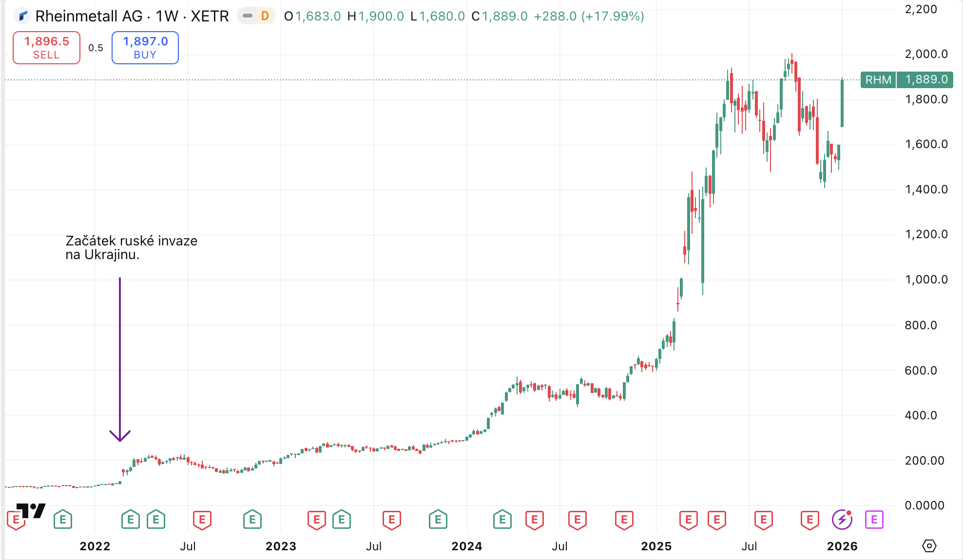 Od začátku ruské invaze na Ukrajinu 24. února 2022 akcie vyrostly o 1 900 % a je více než zřejmé, že investoři vnímají Rheinmetall jako dlouhodobého vítěze současné evropské bezpečnostní krize.