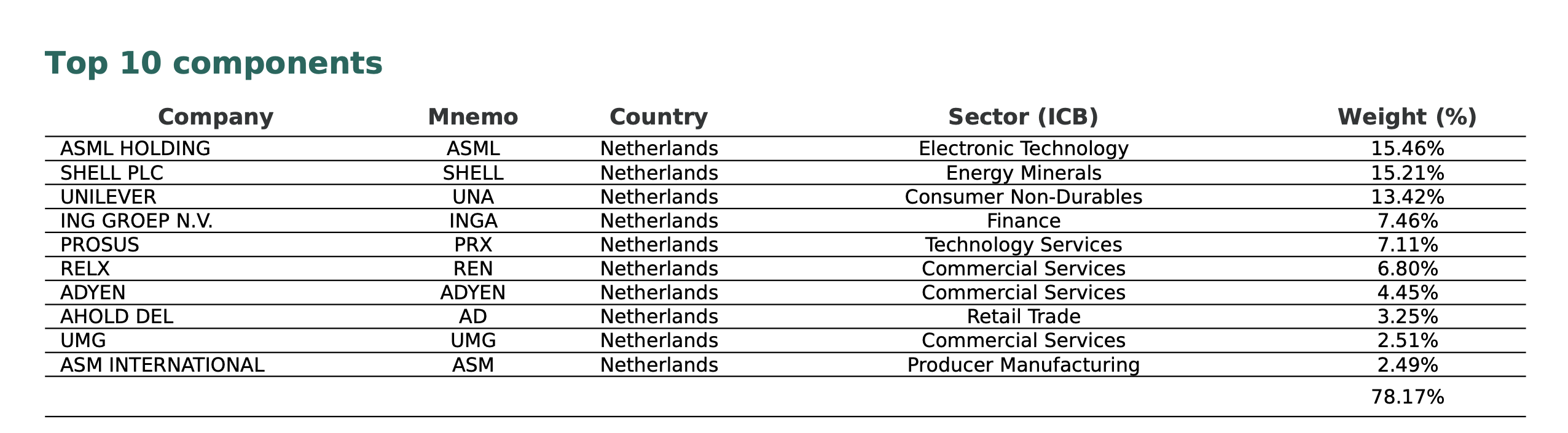Index je silně koncentrovaný, první desítka společností má celkovou váhu 78 %. Největší nizozemskou společností je ASML Holding, která má v indexu váhu přes 15 %.