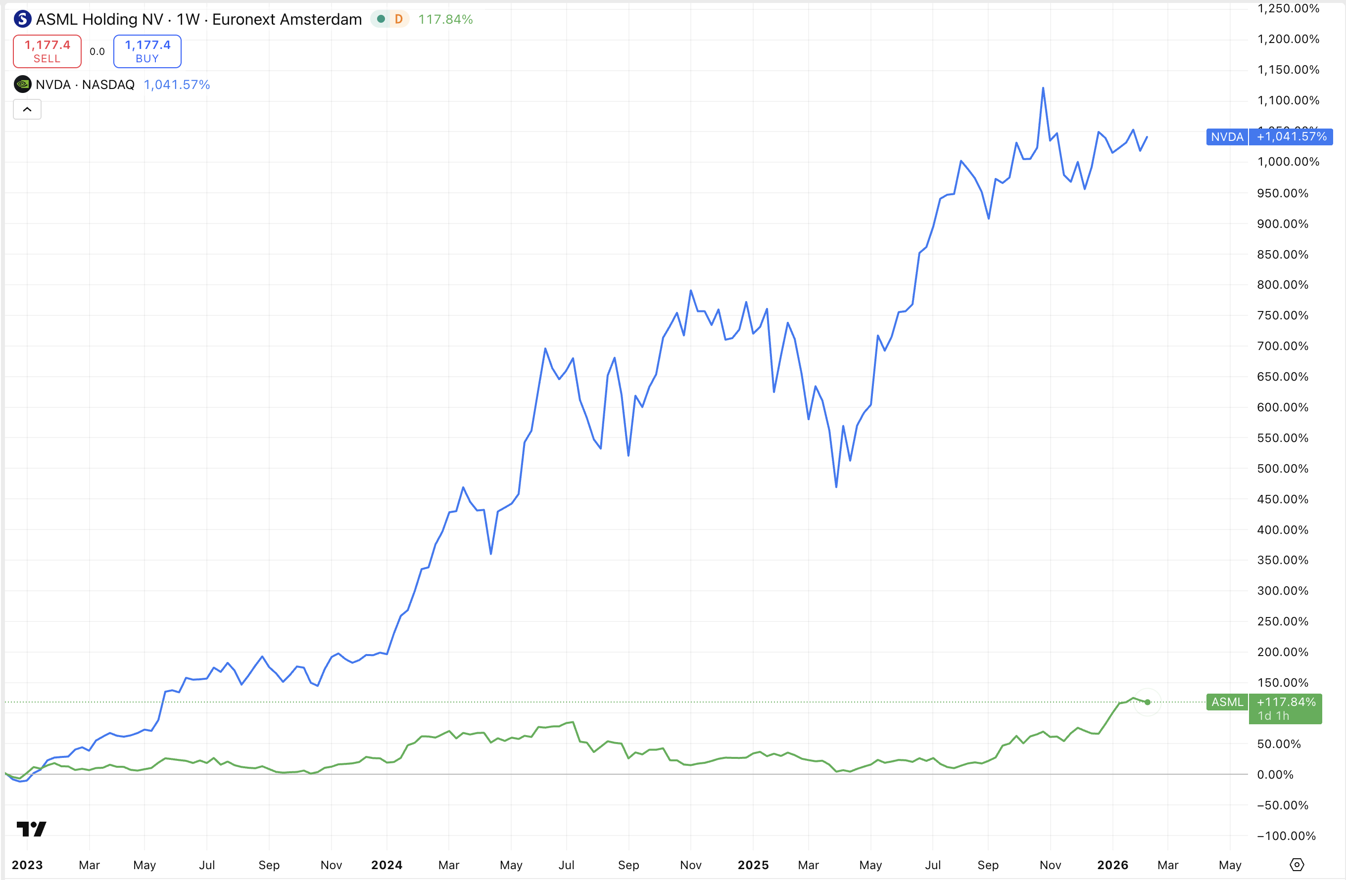 Graf níže ukazuje srovnání výkonnosti akcií ASML (zeleně) a společnosti Nvidia (modře) za poslední tři roky. Zatímco Nvidia vzrostla o více než 1 000 %, akcie ASML si za stejné období připsaly přibližně 120 %.