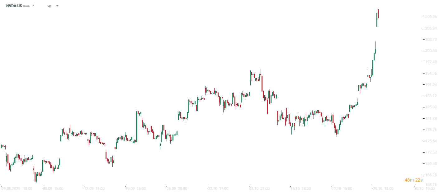 Akcie Nvidie posilují po řadě nedávných oznámení, která upevnila její dominantní postavení v oblasti AI. V úterý generální ředitel firmy Jensen Huang informoval o objednávce čipů za 500 miliard USD. Nvidia také oznámila partnerství s firmou Uber v oblasti robotických taxi a investici jedné miliardy USD do společnosti Nokia. Tyto firmy plánují spolupracovat na technologii 6G. Nvidia rovněž spolupracuje s americkou vládou na vytvoření sedmi nových superpočítačů s AI.