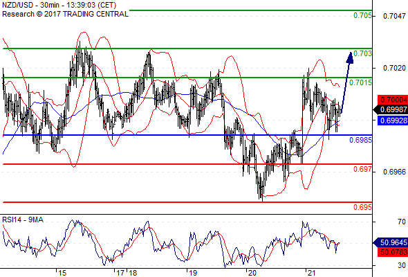 Preferovaný scénář: Dlouhé (long) pozice nad 0,6985 s cílem na 0,7015 a dále pak až na 0,7030.