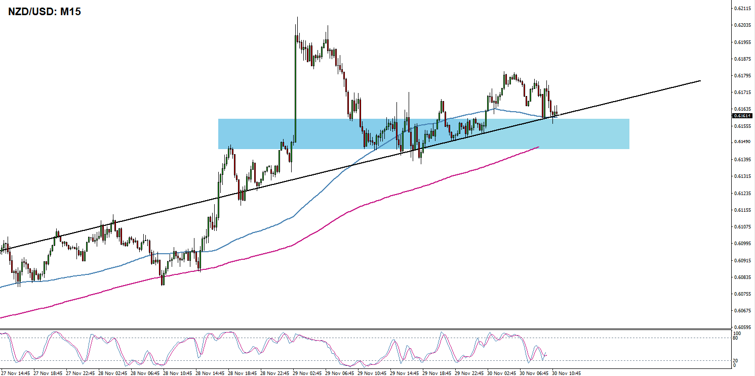 Měnový pár NZD/USD se na 15minutovém grafu obchoduje v rostoucím trendu a nyní dochází k otestování důležité S/R zóny kolem hladiny 0,6160, která koresponduje s trendovou linií a také s klouzavým průměrem SMA 100. Dočkáme se zde odrazu vzhůru, kde trh půjde otestovat předchozí swingová maxima nebo naopak dojde k průrazu S/R zóny a poklesu na nižší úrovně?